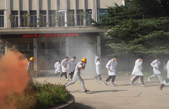 下午2时50分演练总指挥发出紧急警报。任课教师组织员工从实验室迅速撤离,实验室工作人员分楼层组织员工撤离,楼外引导员组织员工逆风向疏散至实验楼东侧。到达临时集中地后,任课教师检查员工情况,向演习指挥员报告情况,对受伤人员进行临时救治并及时送医。